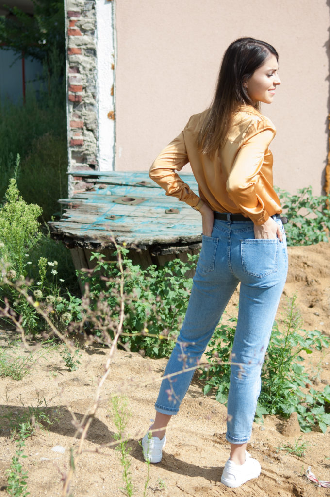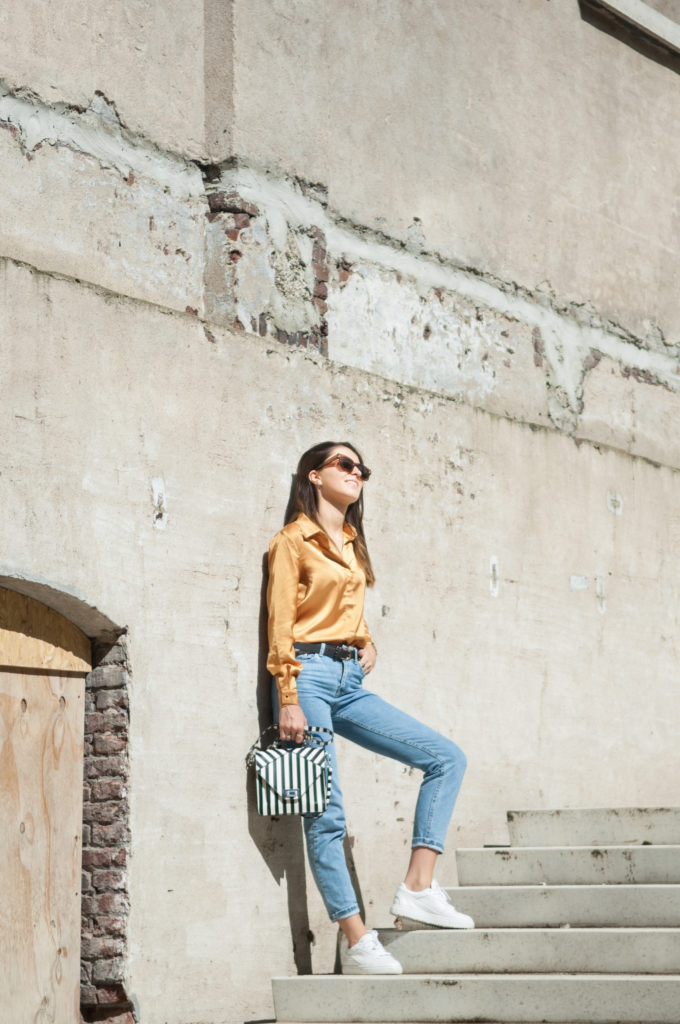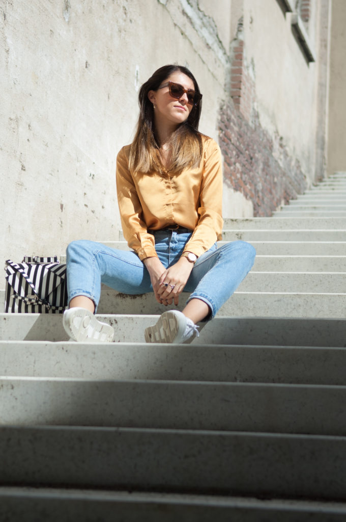 This time I am wearing a mom jeans combined with this silk inspired yellow blouse. I have to say since the weather was so bad lately, I wasn’t in the mood to wear so much color. But the sun came out and my mood turned into ‘Summer’ again.